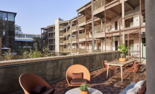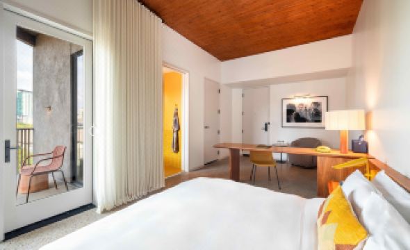 The design of the 89-room hotel pays homage to the local lake house ethos of the early 1970's, situated amongst rolling grounds and natural beauty inspired by Texas. The Hotel Magdalena is also home to a restaurant, poolside bar, and several other spaces for hosting events and hanging out. Situated on Music Lane in the South Congress neighborhood amidst Austin's most vibrant culture and history, Hotel Magdalena overlooks downtown and the Capitol from steps away. Bunkhouse’s largest hotel to date, Hotel Magdalena features four new, but distinct, buildings connected by exposed elevated walkways and courtyards, creating a treehouse feel inside the grounds. The property sits at varying elevations, an homage to the slopes of Barton Springs, and the lush grounds are planted with native Texas species including Bigtooth Maples, Redbuds, Meyer Lemon Trees, Yaupon Holly, and Little Gem Magnolia.