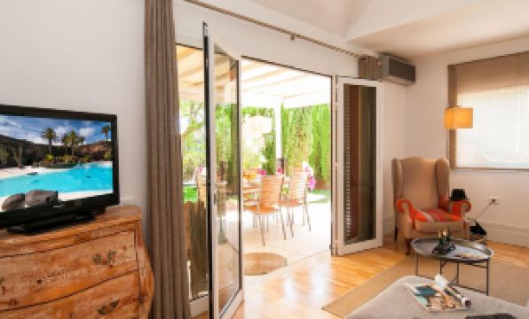 Bungalow Melocotones NF is equipped with a very well equipped kitchen with oven, microwave and other utensils to make your stay more pleasant, the kitchen is open to the living room from which you can access the terrace and garden through its large windows. The whole house has a different and very special decoration, which makes it a unique property.