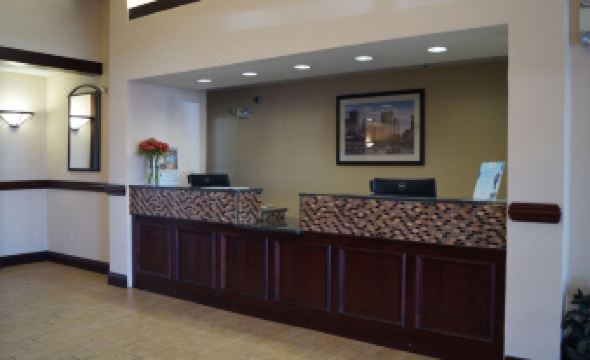 The check-in and check out was super easy! The free airport shuttle was super helpful as well. My room was spacious and comfortable. The breakfast had a wide selection of food items. The gym was small and cramped but luckily not occupied. The surrounding area had a diner and a gas station with a Mexican restaurant attached.