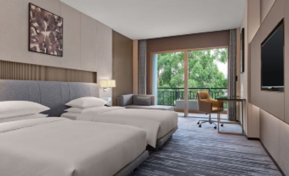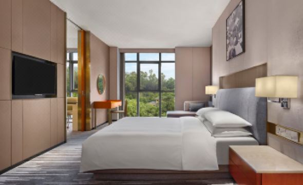 Located at the foot of Qi Feng Mountain, a city landmark in the center of Dongguan, Dongguan Marriott Hotel echoes the origin of nature with a sense of awe. It integrates the artistic conception of Lingnan-style mountains and waters into contemporary design language, creating a tranquil haven that is away from the hustle and bustle but still within the city. Situated in a convenient location in the city center, it is adjacent to the subway and the CBD business district, and it can directly reach Guangzhou and Shenzhen International Airports within an hour.Newly unveiled in 2025, 262 guest rooms and 40 executive apartments are based on simple oriental aesthetics and integrated with modern elegant and luxurious style. Most of the guest rooms are equipped with viewing balconies, allowing guests to overlook the lush Qi Feng Mountain or privately enjoy the urban tranquil oasis. The outdoor mountain-view swimming pool, indoor constant-temperature swimming pool, and gym invigorate the body and mind. The Lounge and M Club provide distinguished resting enjoyment for travelers. City Bistro, an all-day dining restaurant, presents a variety of international delicacies. Man-Ho Chinese Restaurant elaborately interprets the essence of Cantonese flavors of the destination.It has a flexible meeting and banquet space of 2,246 square meters. The multi-functional halls and conference rooms are well-lit. The 180° panoramic floor-to-ceiling windows of the banquet hall bring the green mountain scenery indoors, creating a visual enjoyment surrounded by greenery. In addition, the outdoor banquet space covering an area of 800 square meters is surrounded by blue sky, white clouds, and lush green plants, making it suitable for hosting lawn wedding ceremonies, celebration banquets, etc. Here, it creates extraordinary and important moments in life!Using nature as the backdrop and cultural heritage as the brush, it redefines the aesthetics of urban sojourns in the Guangdong-Hong Kong-Macao Greater Bay Area. Amid the symphony of mountains, waters, and the city, one can find a place for the body and mind to return.Finally, be physically in prosperity and let the mind rest above the clouds!