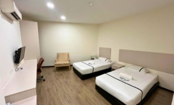 Quick check in with deposit RM20. The Staff is friendly & helpful. Location is good & easy to find. there are Kk Mart, Mamak, 99 speedmart & Chinese food stall besides this hotel. We booked a family room with 2 double bedroom. Room is big & clean. Table,and cupboard is a bit old but is ok. The toilet is clean. Bed is comfort. We can hear motorcycles pass by although the window is closed. We feel good to stay for 2 nights. Tq.