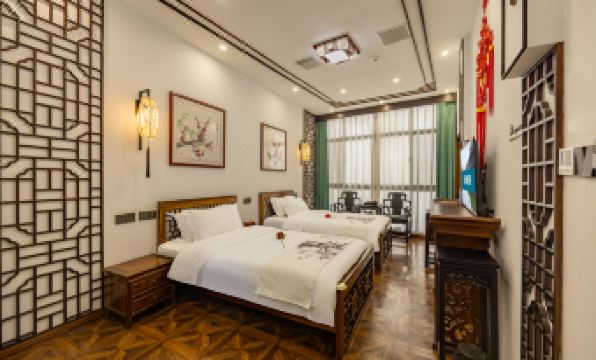 The hotel is located in the southern core scenic area of the ancient town, covering an area of over 1000 square meters. It consists of 3 buildings, 8 guest rooms, 4 courtyards, a Chinese restaurant, a coffee shop, and a thatched tea house. Facing the former residence of Zhang Shiming across the river, it takes no more than 4 minutes to reach the hotel from the south gate of the scenic area. Within a 5-minute walk, you can reach attractions such as Xiaolianzhuang, Zhang Shiming's former residence, Jiaye Library, Liu's staircase, and more.