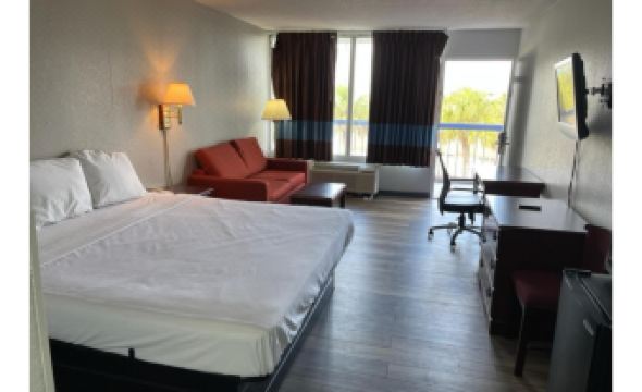 Area outside of room filthy & smelled of urine. The toilet was peeling paint & the bottom in the toilet was permanently stained. The tub had a permanent stain and both toilet & tub needs replacement. In my opinion there’s no way that room should’ve been available for rent and especially at the price point.