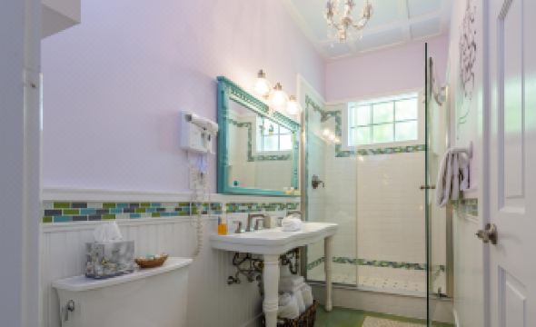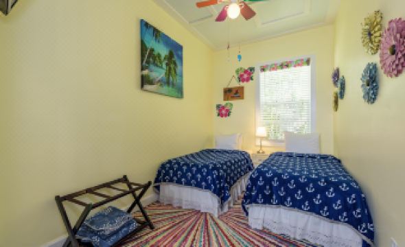 Both bedrooms share the common area bath, with double-basin pedestal sink and beautifully tiled walk-in shower. One bedroom has a king bed and the other has two twin beds. Both bedrooms and the living room contain flat-screen TVs. The large front porch is a few steps above the street, making it the perfect place to sit on the wicker chairs and relax with your morning coffee.
