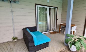 離碼頭大概10分鐘路程。路口就有超市。房間有微波爐和冰箱。門口有一個游泳池。院子裏有散養的溜達雞🐔。