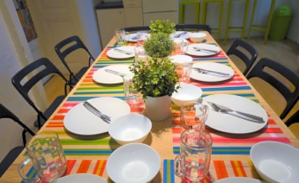 There was a common area in our flat which had a kitchen and an exercise machine. The kitchen had a table with seating for four and enough cutlery and dishes to go around. It had a cooking stove/hob, fridge and kettle. They provide dish soap and cleaning cloths/sponges too.