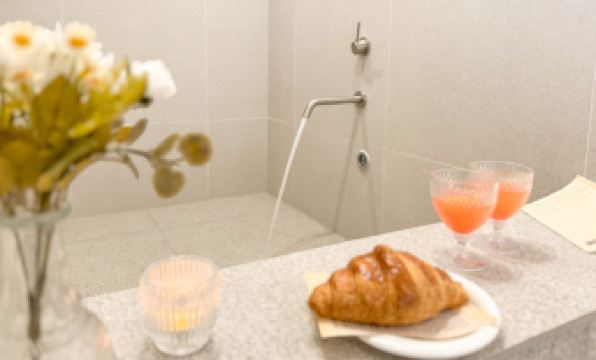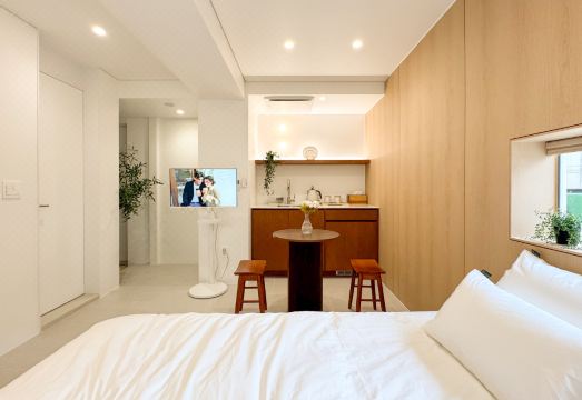 Everything you need is provided: foam cleanser, toothpaste set, bath salts (Himalayan salt) for the bath, coffee, tea bags, and more. There was also a coffee pot and hairdryer. The refrigerator isn't pictured, but it's under the vanity in front of the bed. It's small, but it works well. It's best to assume there's no freezer. There's a microwave and small snacks provided in the common area (lobby). There's also a TV, and Netflix is available with the account provided by the property (Netflix only). The water pressure in the bathroom was really strong, which I liked. The air conditioning isn't centralized, so you can adjust it however you want. I tend to get hot easily, so I used the air conditioning even though I visited in December;;; It was so cool and comfortable 😂