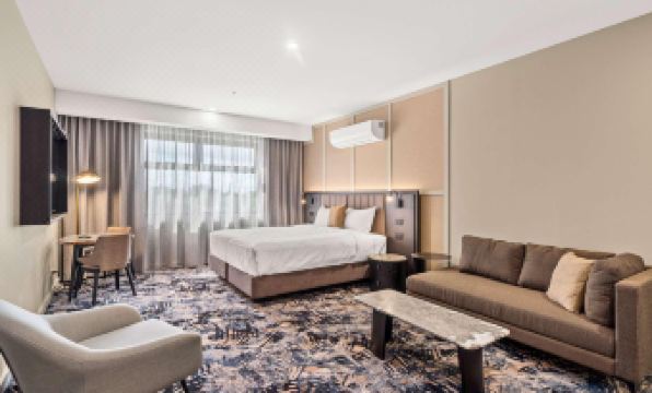 Located in central Shepparton, the Mantra Hotel offers stylish, contemporary accommodation with easy access to the CBD, Goulburn Valley Hospital, and local attractions. Featuring the latest Accor Hotels design, amenities include Free Purezza Sparkling Filtered Water, Grab and Go Mini Mall, Self Serve Coffee Machine, and a cafe style reception area. The hotel has 59 rooms, including 1 and 2 bedroom suites, all with kitchenettes, high speed WiFi, and streaming services. Ideal for business or leisure stays.