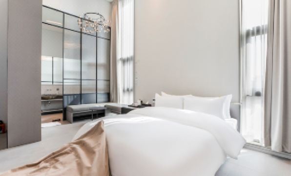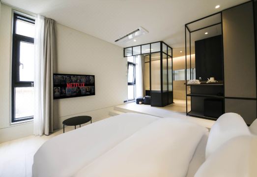 I stayed one night for a concert. There was some dust in some areas, but since I only went to sleep, it wasn't a big deal. The high ceilings made the room feel spacious. The bathroom was located next to the bed and separated by glass, so friends could see into it, but since I was alone, I didn't mind. The shower room was separate from the bathroom. Bathrobes and towels were provided, along with small bottles of shampoo, conditioner, and body soap. The bathrobes were a little worn and looked old. There were two free bottles of water in the refrigerator. There were two convenience stores nearby, which was convenient. It was about a 35-minute taxi ride to Incheon Airport, and the front desk arranged a taxi for me.