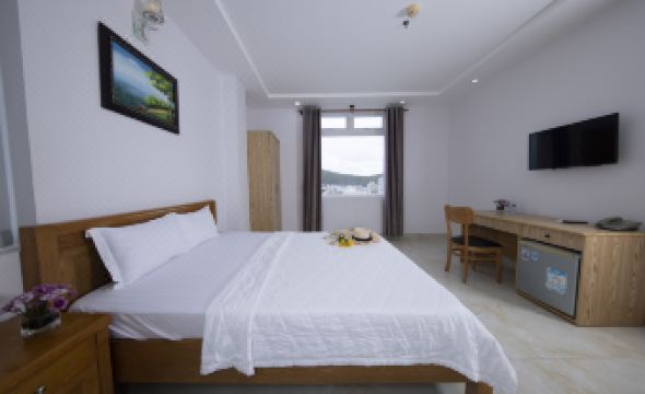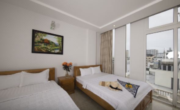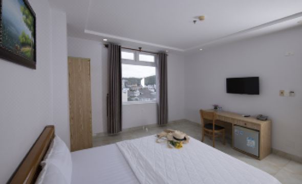 This is a good hotel, relatively clean, but the shower glass had water stains and wasn't clean. There was a musty smell in the room, like dampness, but opening the windows helped. There were no insects. There's no kettle or hairdryer in the room, but I asked at the reception and they provided a kettle. The location is convenient, just a 5-minute walk to the public beach. However, swimming there was impossible; the sea was dirty, full of trash, with big waves, and there were black flags with skulls, meaning they wouldn't let people swim and kept whistling warnings. I walked 30 minutes to a beach near the Christ statue and a Buddhist temple on the rocks, where the sea was clean and the waves were small. Lotte Mart is a 25-minute walk away. Hot water was available in the room, but the drain was a bit slow. Everything else was fine. The staff, including the gentleman at the entrance and at reception, were very friendly. They helped me call a bus to Ho Chi Minh airport and extended my stay until 7 PM for 200,000 VND.