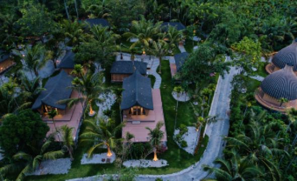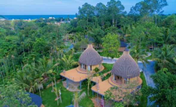 The environment here is fantastic, nestled on a small hill with plenty of fruit trees. It was my first time seeing a jackfruit tree; it wasn't very tall, but it was adorable, laden with jackfruits. The hotel isn't far from the sea, and there's a golf cart shuttle service available. The surrounding area has many trendy spots and is very lively. Breakfast was also good, and the auntie (staff member) was very nice.