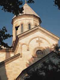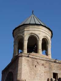 Looking up at the Holy Trinity Church on Mount Kazbek, a cloud paradise