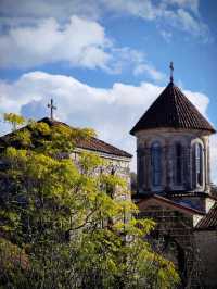 Looking up at the Holy Trinity Church on Mount Kazbek, a cloud paradise