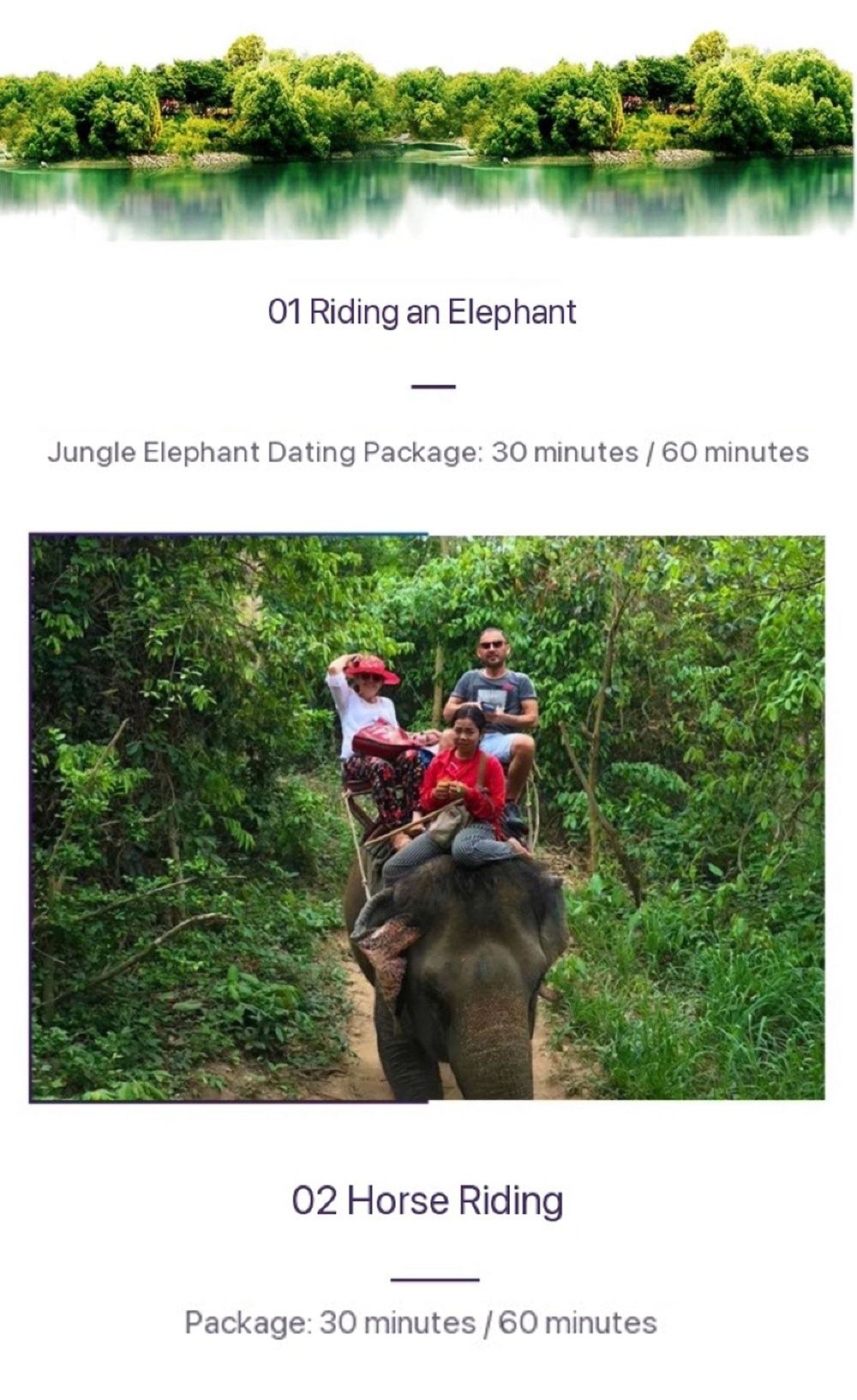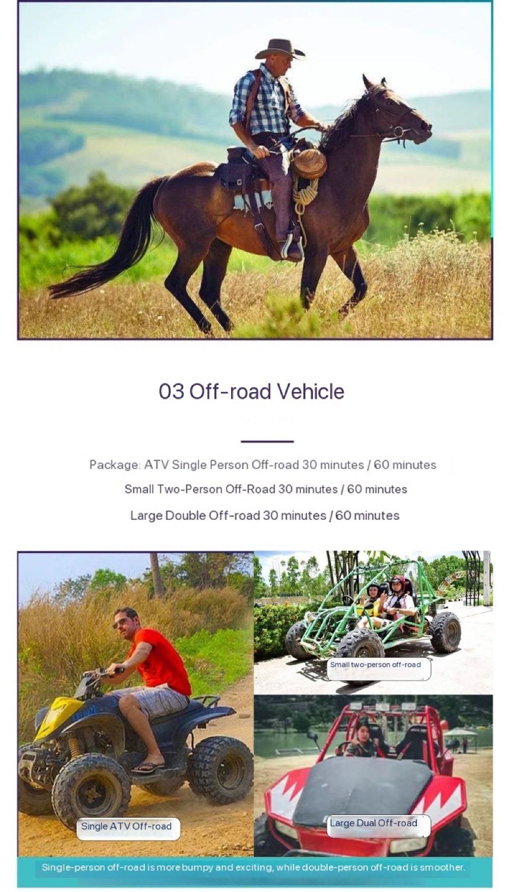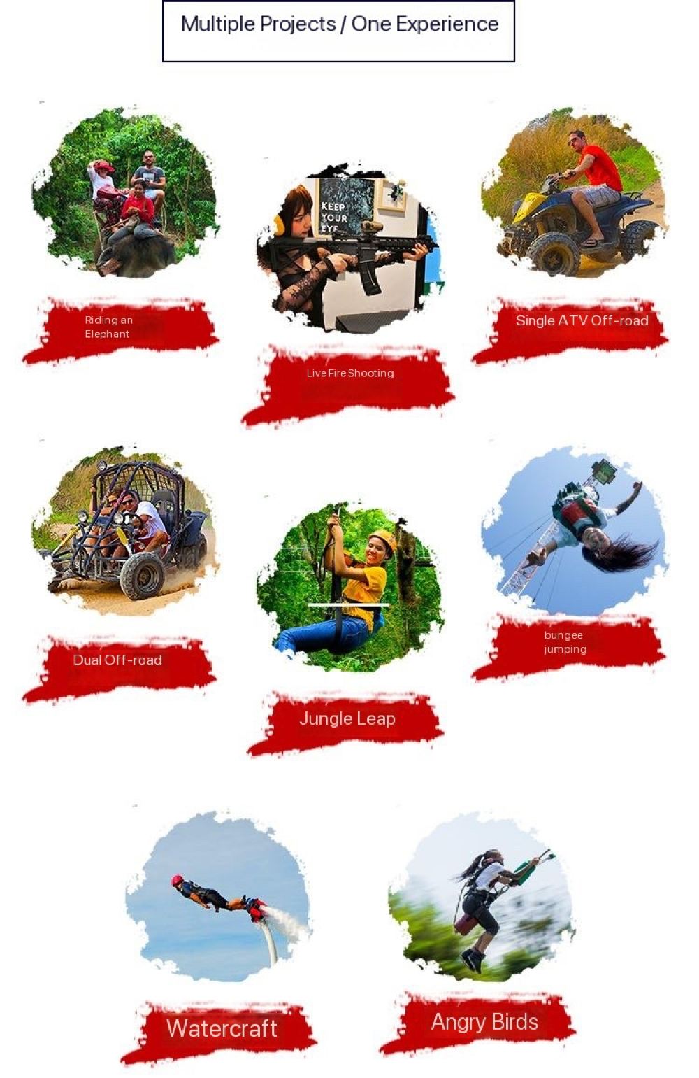 Elephant riding, ATV, ziplining, shooting, and karting with numerous options to choose from