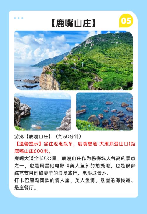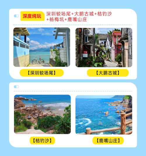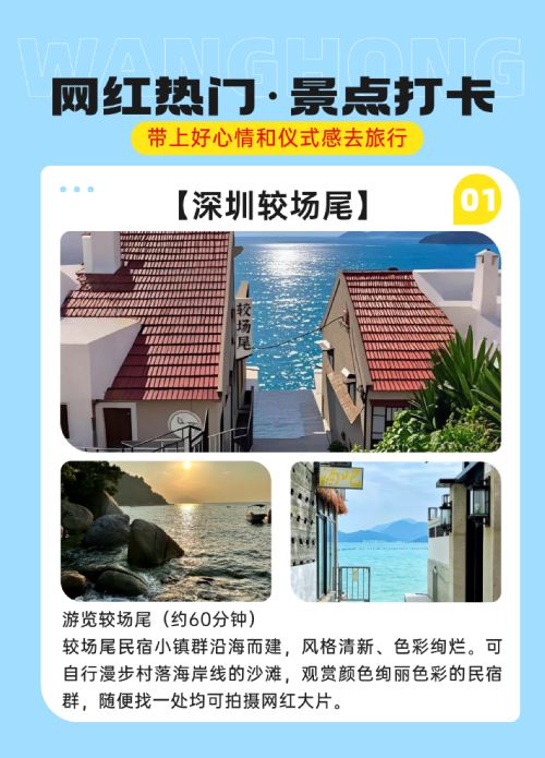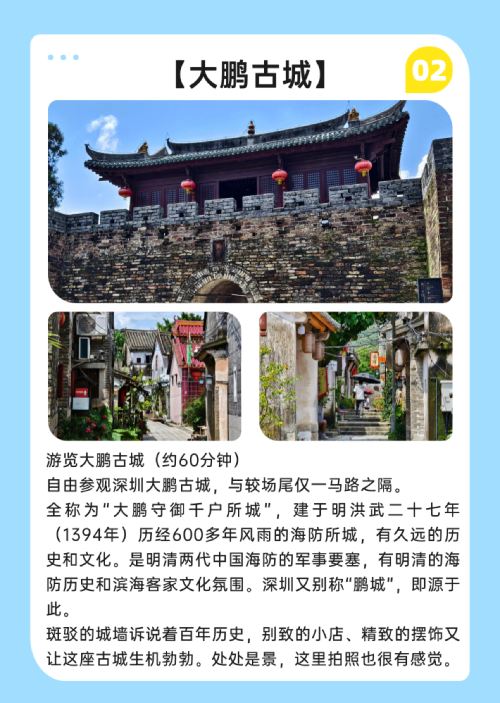 Dapeng Ancient City, the top of Shenzhen's Eight Scenic Spots and one of Shenzhen's Top Ten Landmarks; "Shenzhen's Little Gulangyu" Jiaochangwei, a cluster of artistic seaside homestays, perfect for capturing stunning photos.