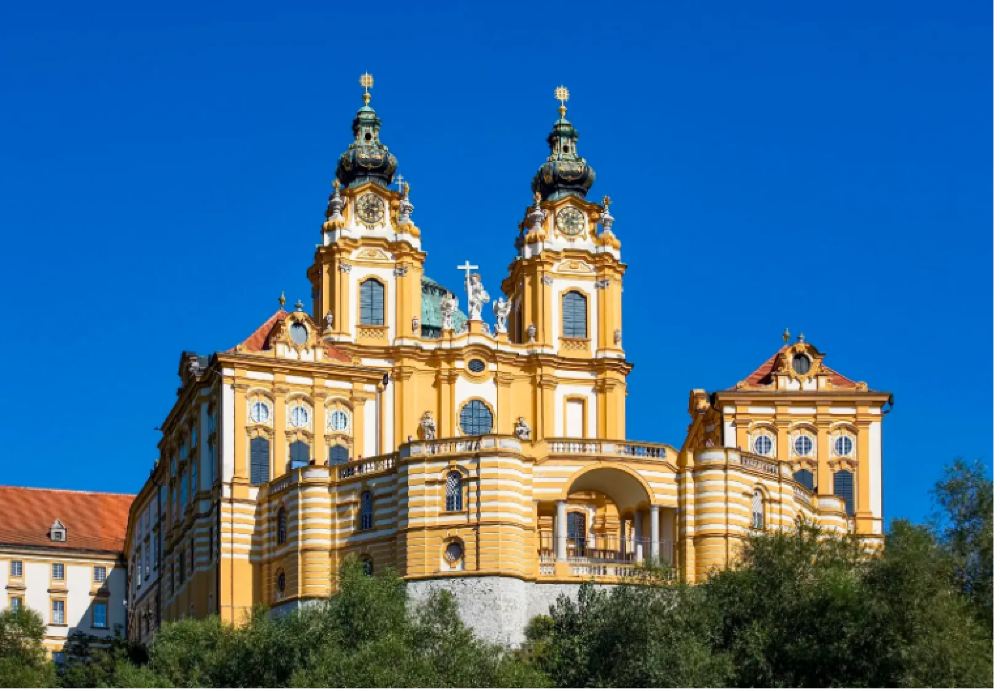 ▲ Melk Abbey (Stift Melk) is a Benedictine monastery situated on a rocky outcrop in the town of Melk, Lower Austria, Austria, overlooking the Danube River and adjacent to the picturesque Wachau Cultural Landscape. Founded in 1089, the awe-inspiring Baroque structure seen today was constructed between 1702 and 1736, featuring exquisite frescoes and a library housing countless medieval manuscripts.