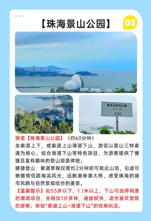 Visit Sun Yat-sen's Former Residence; explore Zhuhai's landmark attractions; take a cable car ride in Jingshan Park to overlook the coastal scenery of Lovers' Road and get a distant view of the Hong Kong-Zhuhai-Macao Bridge.