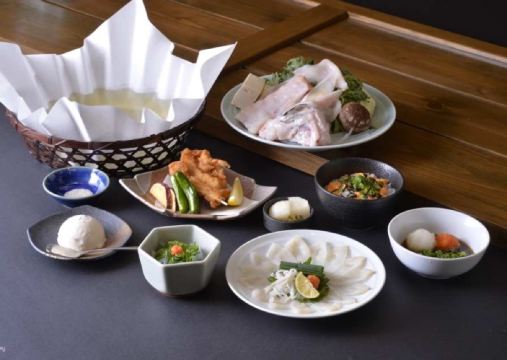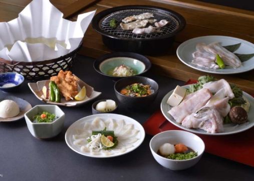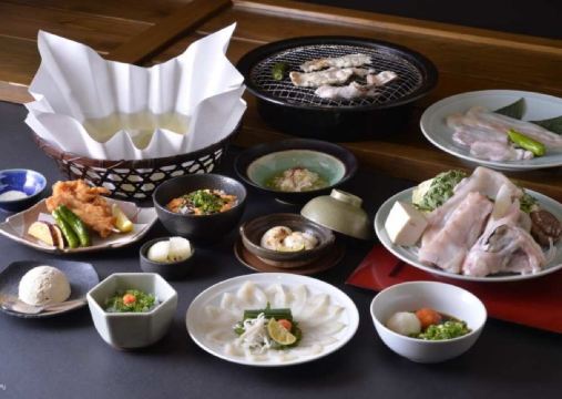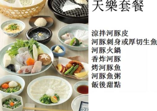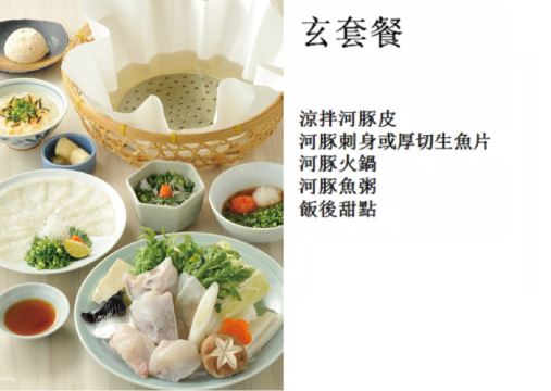 Cold dressed pufferfish skin, pufferfish sashimi or thick-cut raw fish, pufferfish hot pot, deep-fried pufferfish, grilled pufferfish, pufferfish congee, and dessert