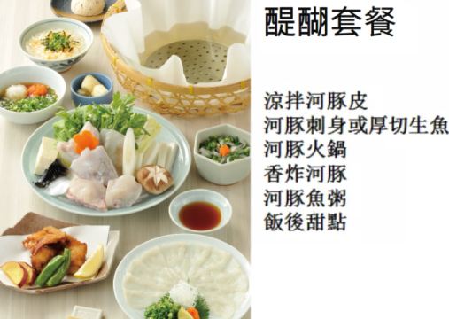 Cold dressed pufferfish skin, pufferfish sashimi or thick-cut raw fish slices, pufferfish hot pot, pufferfish congee, and dessert