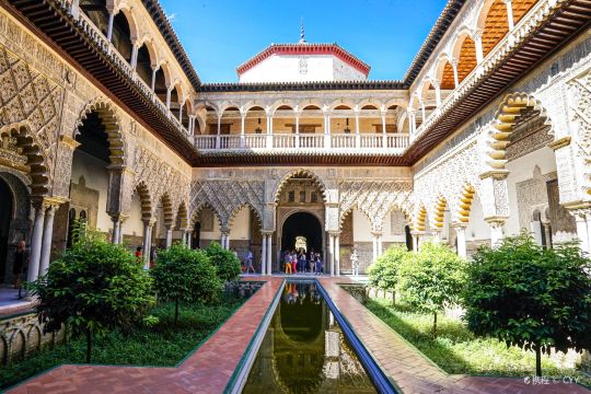 The Royal Alcázar of Seville was originally a Moorish fortress. The Almohad dynasty built palaces here very early. The Royal Alcázar of Seville is one of the finest surviving examples of Mudéjar-style architecture.