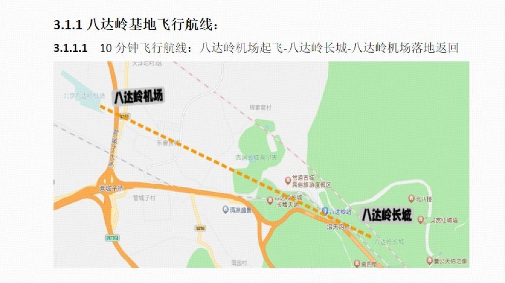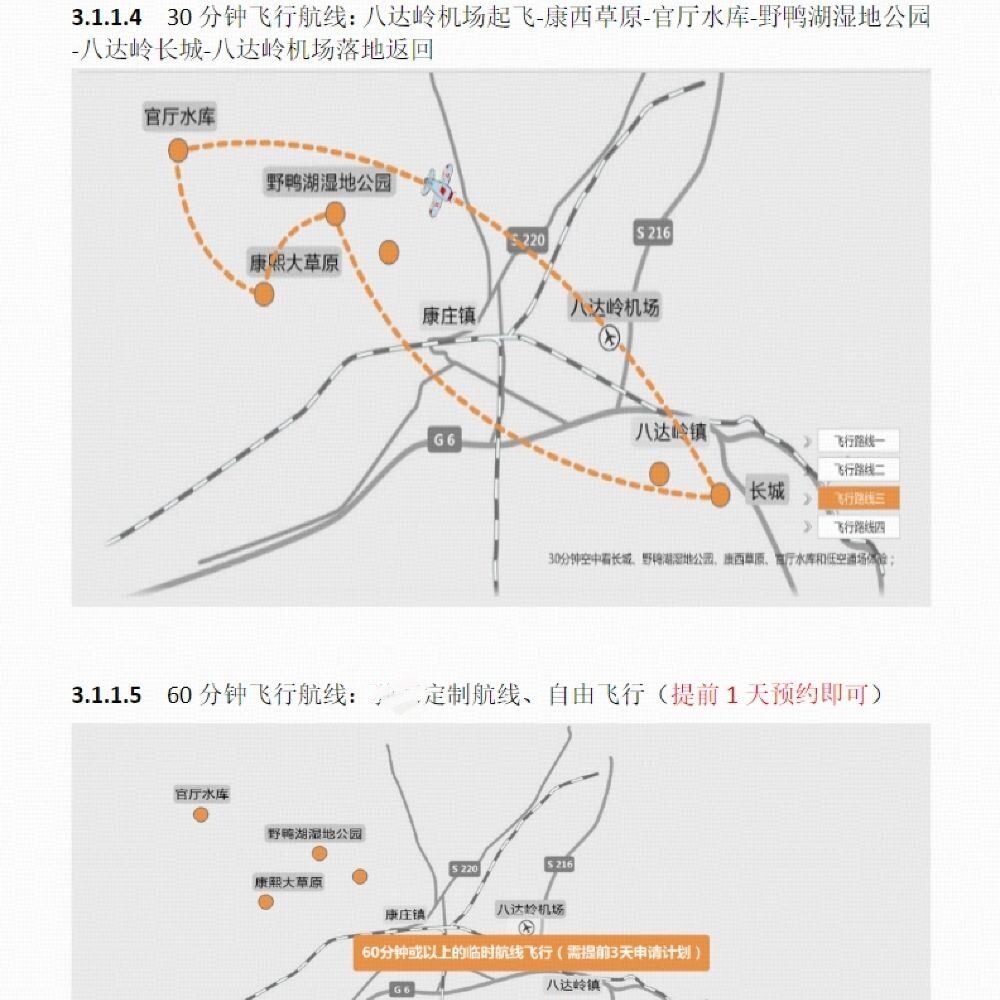 Below is the helicopter route map. Fixed-wing aircraft operate local flights where you can view the Great Wall from a distance (note: flying directly over the Great Wall is not permitted). You can also experience piloting.