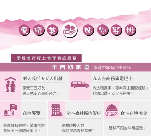 ▲ —Notes— 1. This is a semi-independent travel package itinerary without a tour leader or guide accompanying throughout the journey. 2. Transportation for this itinerary is shared, and you may travel with other passengers. 3. The itinerary content shall be subject to the details on the confirmation sheet; for any changes to the meeting time, please follow the driver's on-site announcement. 4. During special holidays such as winter/summer vacations, cherry blossom season, consecutive holidays, or Lunar New Year, prices will be announced separately. 5. Due to limited mountain resources, meals and accommodations will be simple yet comfortable. Please take note. 6. To avoid disputes, please carefully read the notes, cancellation/postponement policies, booking procedures, and FAQ before placing an order. Placing an order will be deemed as your acknowledgment, understanding, and acceptance of all terms.