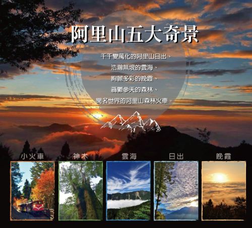 ▲ The Five Wonders of Alishan: The ever-changing Alishan sunrise, the boundless sea of clouds, the colorful sunset glow, the towering lush forests, and the world-famous Alishan Forest Railway.