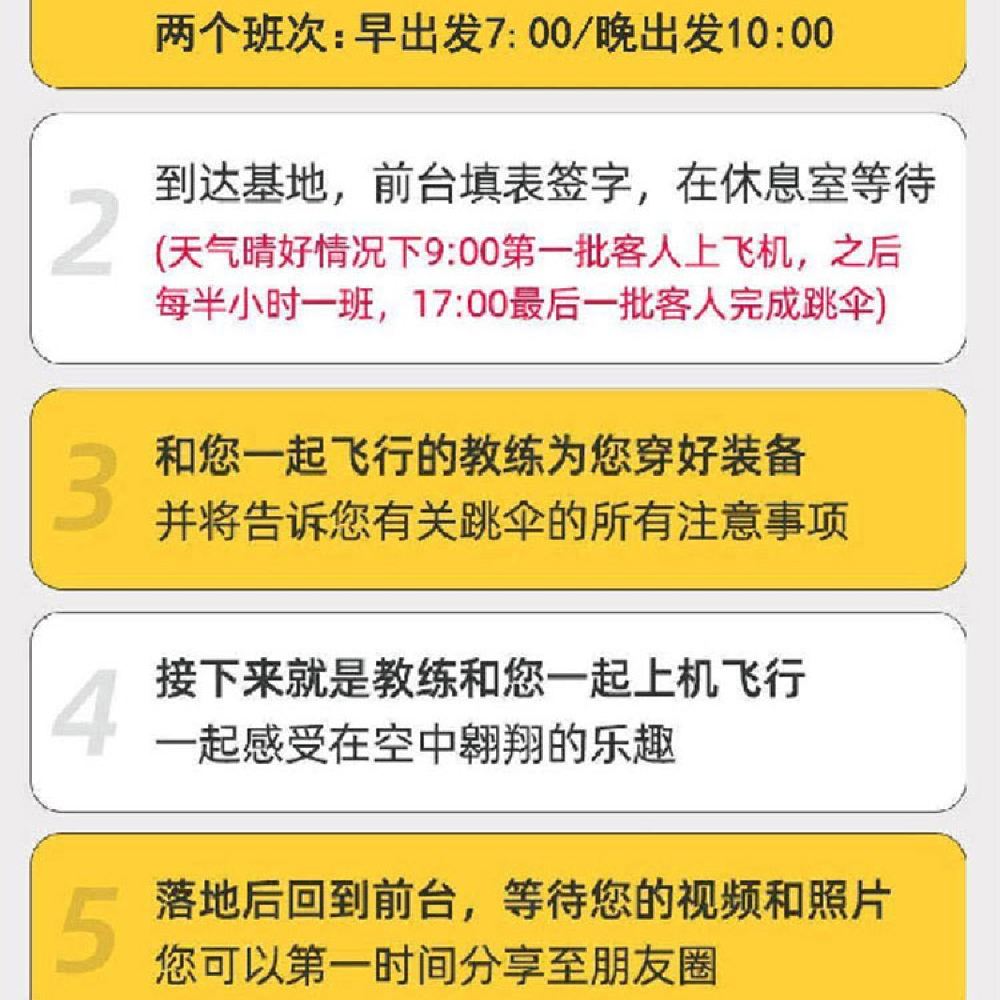 2. Please note that accompanying personnel will incur additional transportation fees. If you have accompanying personnel, please inform our online customer support in advance. You can select the add-on option for accompanying personnel during the payment process. Shared transfers from downtown hotels to the skydiving base are free of charge. If you need to bring luggage, you must notify our online customer support beforehand. Luggage cannot be carried on board without prior notification. Thank you for your understanding!