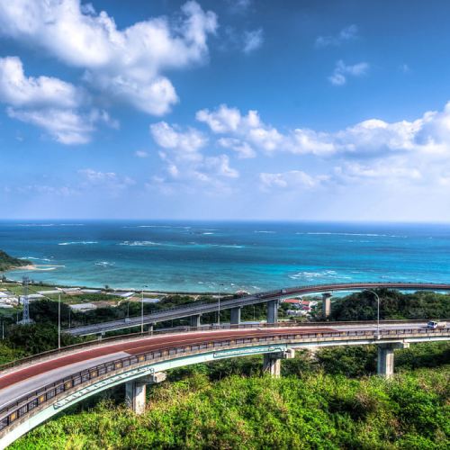 ▲ NIRAIKANAI Bridge NIRAIKANAI is an Okinawan dialect term meaning "the ideal land beyond the horizon." Here, vehicles slow down to a leisurely pace, allowing passengers to admire the breathtaking scenery—a vast expanse of blue sea and sky.