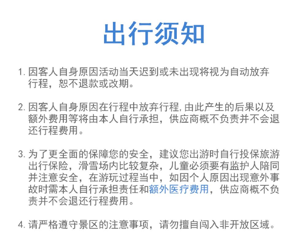 4. If the guest voluntarily abandons the trip midway due to personal reasons, the guest will be solely responsible for any personal safety issues and additional expenses incurred, and no refund will be provided for the trip fees.