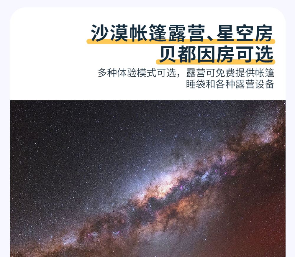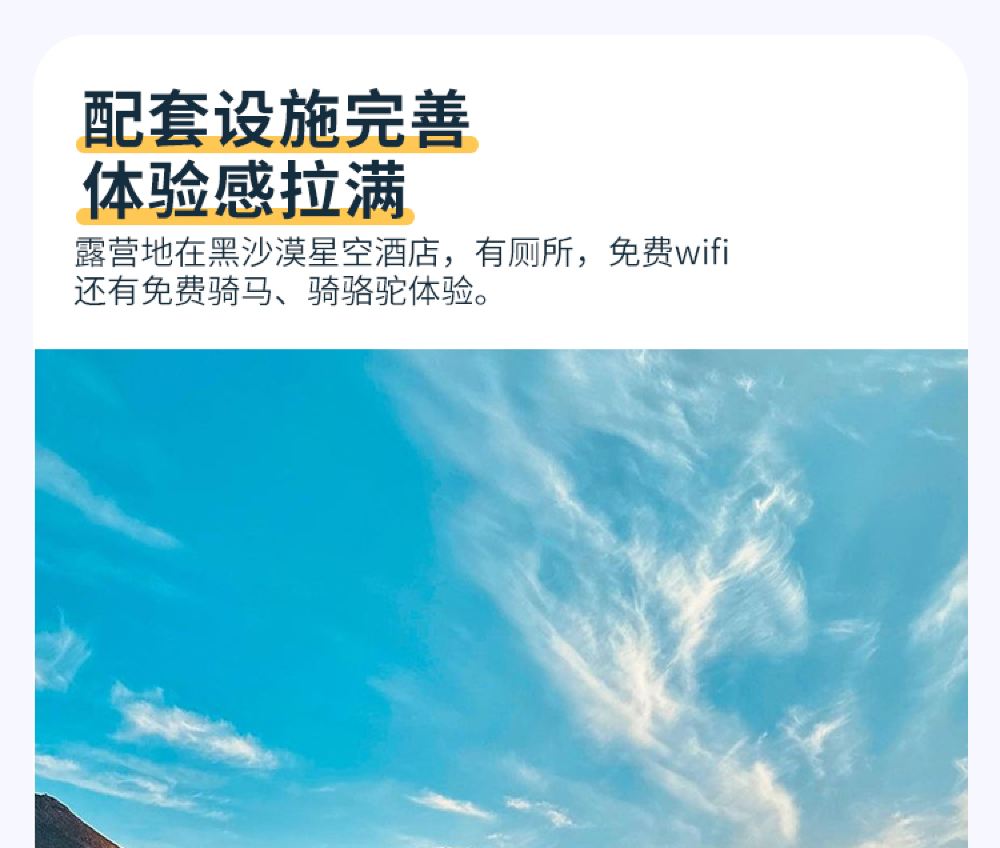 [Complete Facilities] The campsite is located in the Black Desert, featuring restrooms, free Wi-Fi, and complimentary horseback and camel riding experiences.