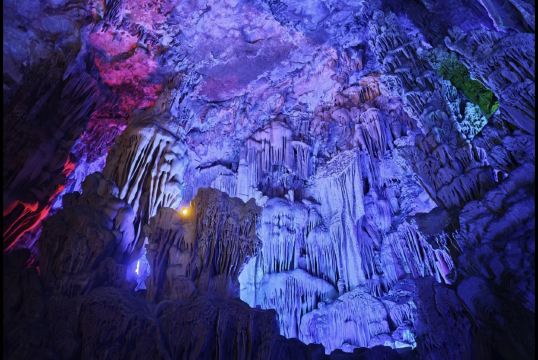 As a brilliant Karst cave marked on almost all travel itineraries, Reed Flute Cave got its name from the verdant reeds growing outside it, with which people make flutes. Actually, inside this water-eroded cave is a spectacular world of various stalactites, stone pillars and rock formations created by carbonate deposition. Illuminated by colored lighting, the fantastic spectacle is found in many variations. Walking through the serried stone pillars, tourists feast their eyes on changing spots, feeling they are in a paradise where the Gods live.