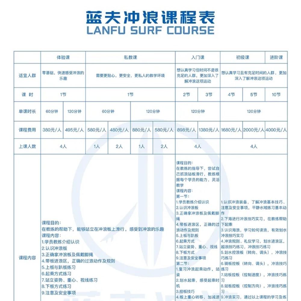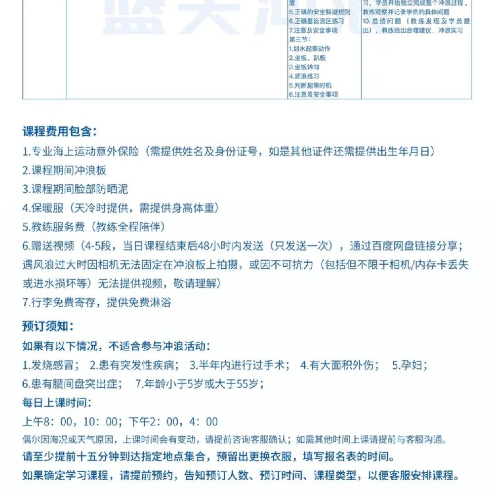 2. The following individuals are not suitable for surfing activities: those with fever or cold, sudden illnesses, surgery within the past six months, large-area external injuries, lumbar disc herniation, pregnant women, or individuals outside the age range of 8-60 years.