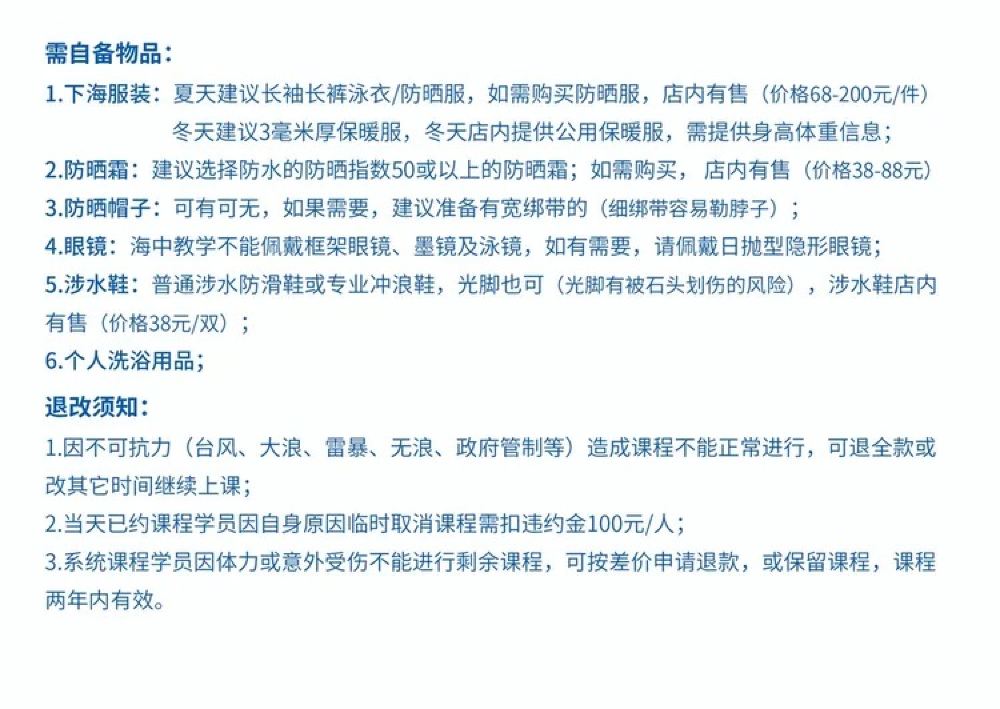 5. In case of classes being unable to proceed normally due to force majeure (typhoon, heavy waves, thunderstorms, no waves, government restrictions), a full refund will be provided or the class can be rescheduled.