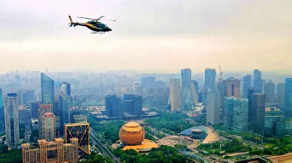 Route 3: Hangzhou Helicopter Tour - Qiantang River Scenic Flight. Flight Base - Asian Games Village - Hangzhou Olympic Sports Expo Center (Hangzhou Century Center) - Xixing Bridge - Fuxing Bridge - Qiantang River Bridge - Six Harmonies Pagoda Cultural Park - Bagua Fields - City Balcony - Flight Base