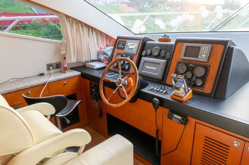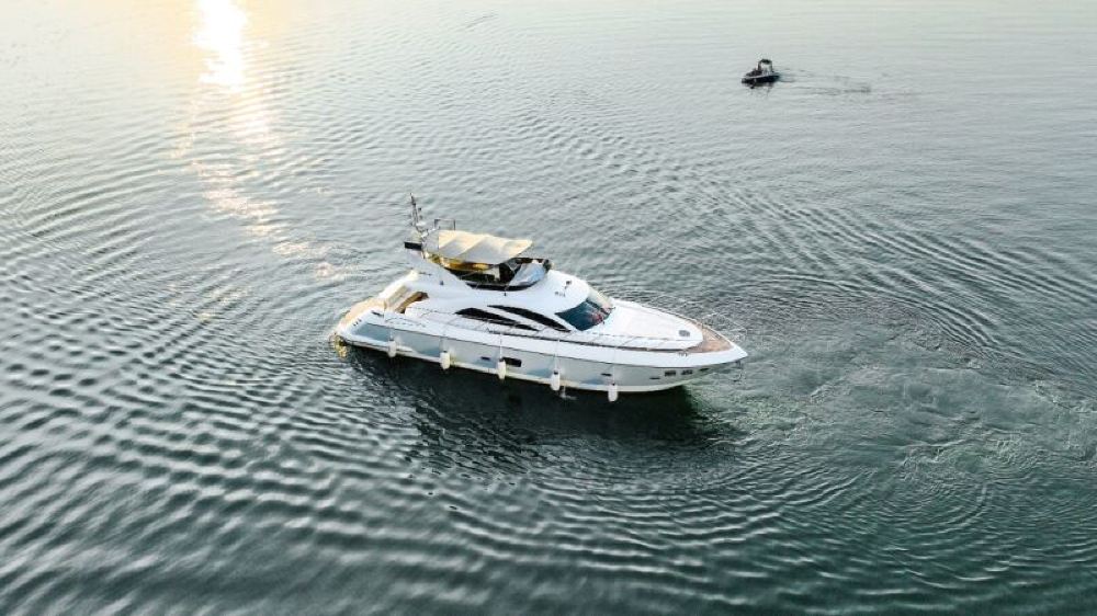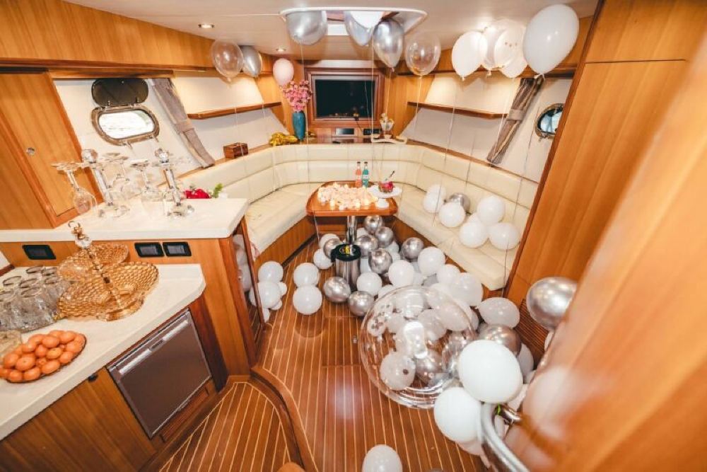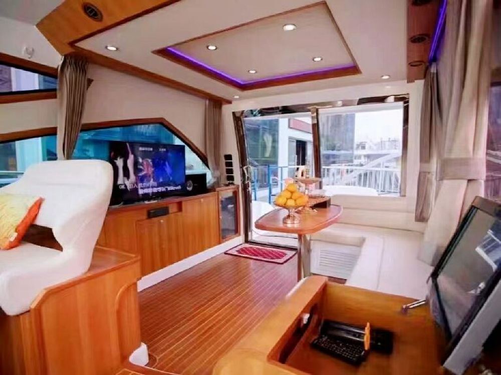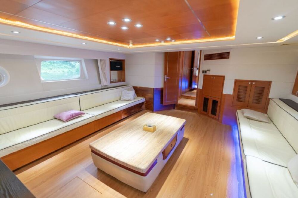 The yacht has 3 decks, featuring a reception lounge, KTV, bedrooms, foredeck, flybridge, and restrooms.