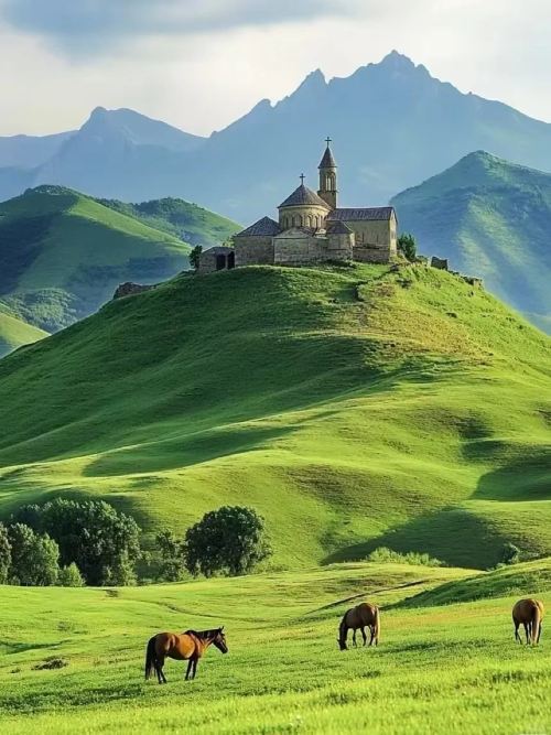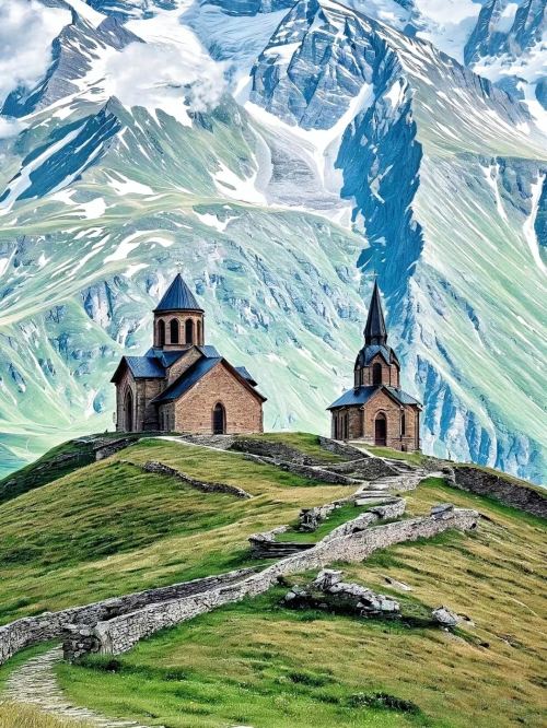 Overlooking Mt Kazbek, a dormant volcano on the border between Georgia and North Ossetia with an elevation of approximately 5,000 meters, it is the third highest mountain in Georgia.