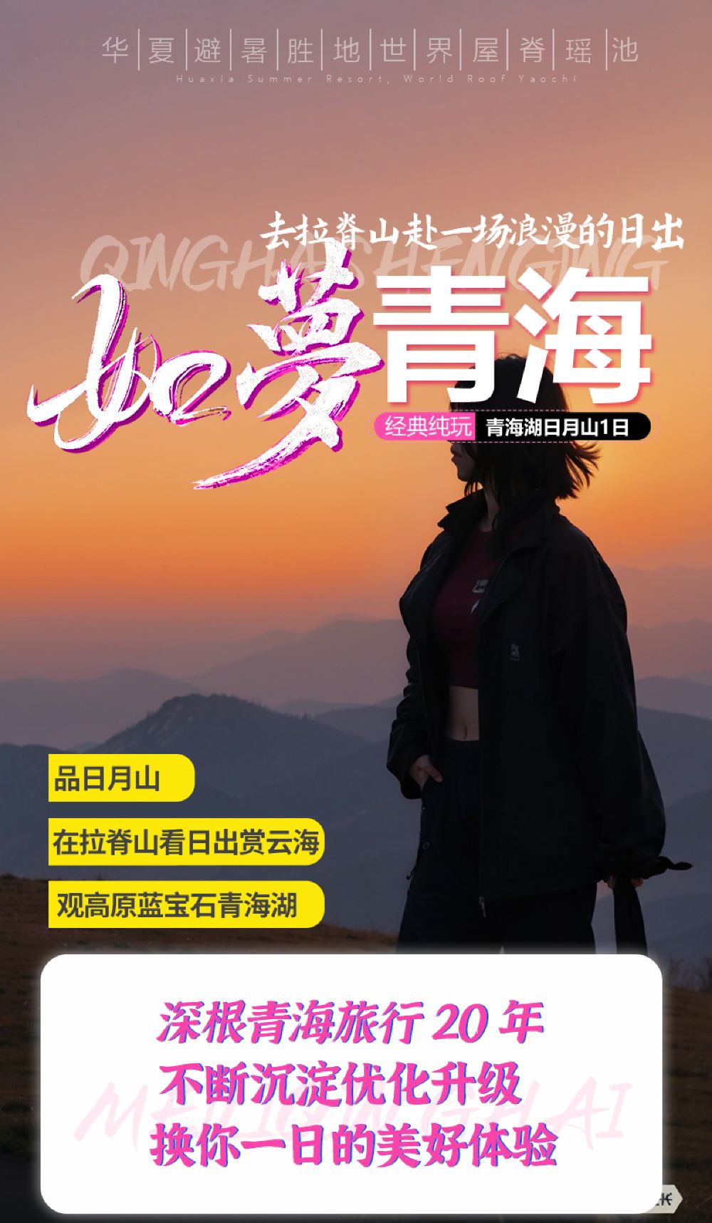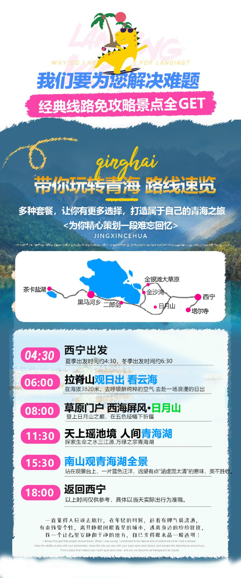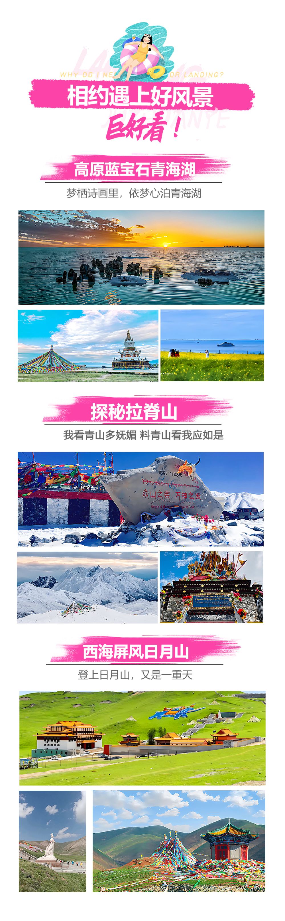A one-day group tour to Xining, Qinghai Lake, Chaka Salt Lake, and Riyue Mountain (including a visit to the "Mirror of the Sky"), all in Chinese.