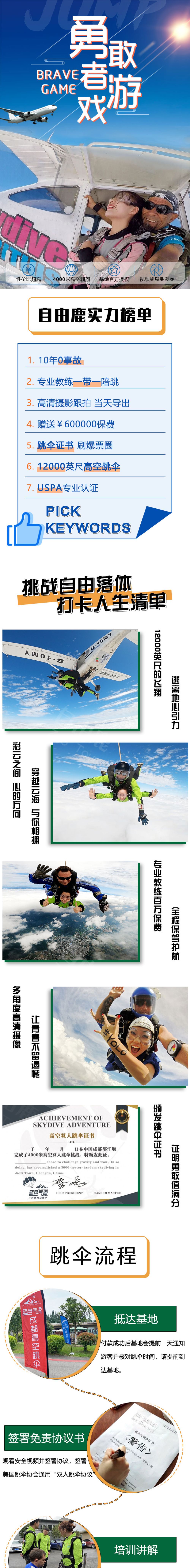 6. It is recommended not to consume excessive alcohol the night before skydiving and avoid eating too much before the activity. Skydiving is not allowed within 24 hours after diving. Pregnant women, individuals with a history of heart or brain conditions, severe hypertension patients, and other special passengers cannot participate in skydiving. If you feel unwell during the activity, promptly inform your instructor.