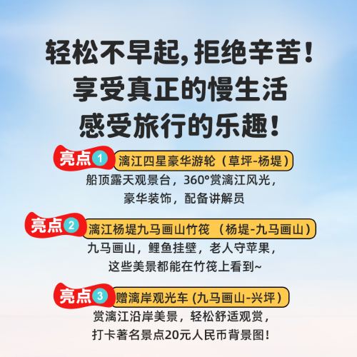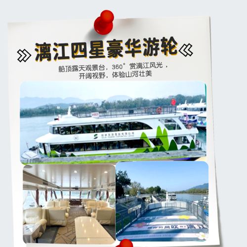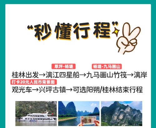 Three Ways to Explore the Li River Scenic Area: 1. Four-Star Cruise (Caoping-Yangdi Section) + 2. Nine-Horse Fresco Hill Bamboo Raft (Yangdi-Nine-Horse Fresco Hill Section) + 3. Complimentary Li River Sightseeing Bus (Nine-Horse Fresco Hill-Xingping Section) + Xingping Ancient Town + 20 CNY Background Scenery Spot