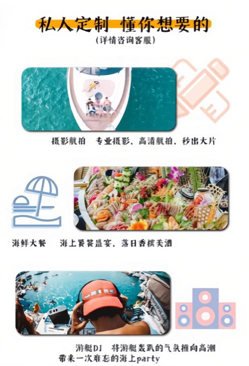 Trip.com's flagship yacht merchant with owned yachts, professional and reliable! No hidden fees! The standard package duration is 3 hours with customizable options. Inclusions include captain and crew service, fuel fees, sea fishing experience, fruits, beverages, mineral water, marine KTV, yacht self-driving, life jackets, plus a complimentary jet ski experience upgrade~