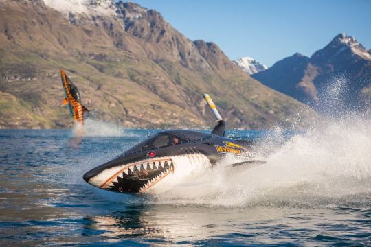 It's time to scream in the Shark Machine. Departing from the berth in Queenstown's city center, we'll take you on an adrenaline-pumping adventure across the picturesque Lake Wakatipu. Like a stunt plane on water—climb into the cockpit and prepare for powerful thrusts as our professional drivers deliver an unforgettable experience. Through the F-16 fighter jet-grade glass of the semi-submersible shark boat, you'll watch the sky disappear before your eyes as your pilot takes you on a long underwater dive before bursting back to the surface, launching the entire 6-meter shark boat into the air. We can perform 90-degree barrel rolls, tight circular turns, reaching speeds of 80 km/h on water and 40 km/h when diving underwater.