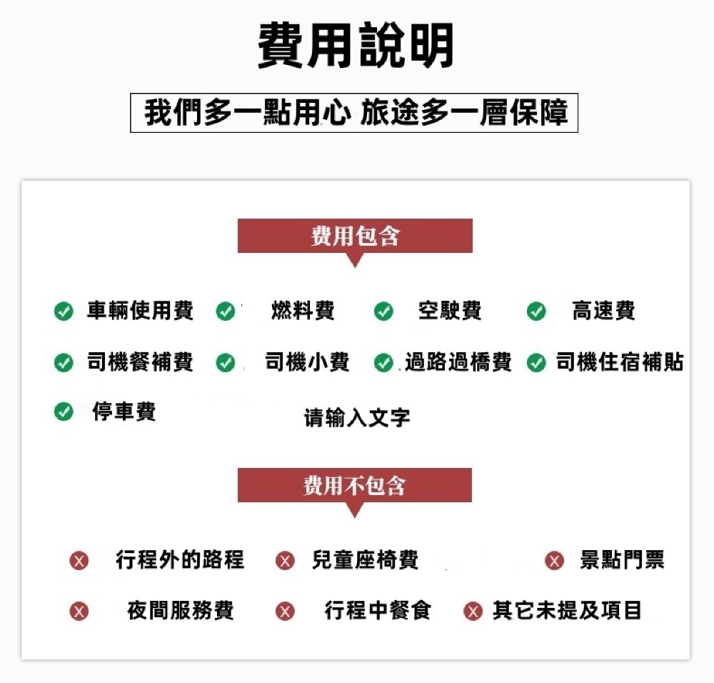*Child safety seat fee, please pay directly to the driver-guide in cash, NT$200 per seat per day.