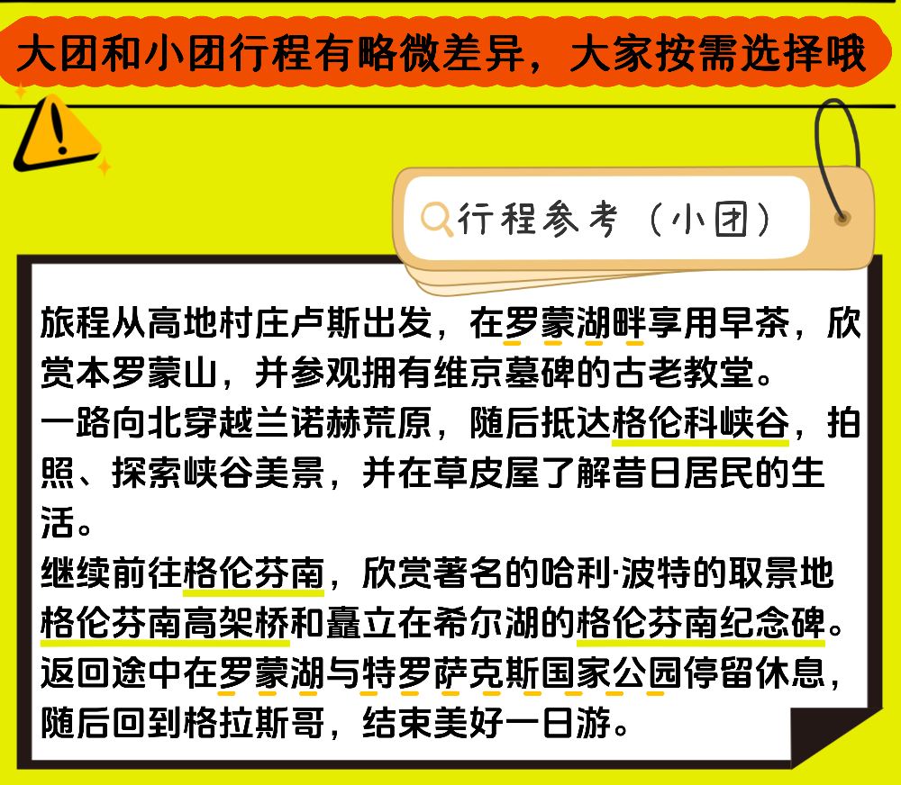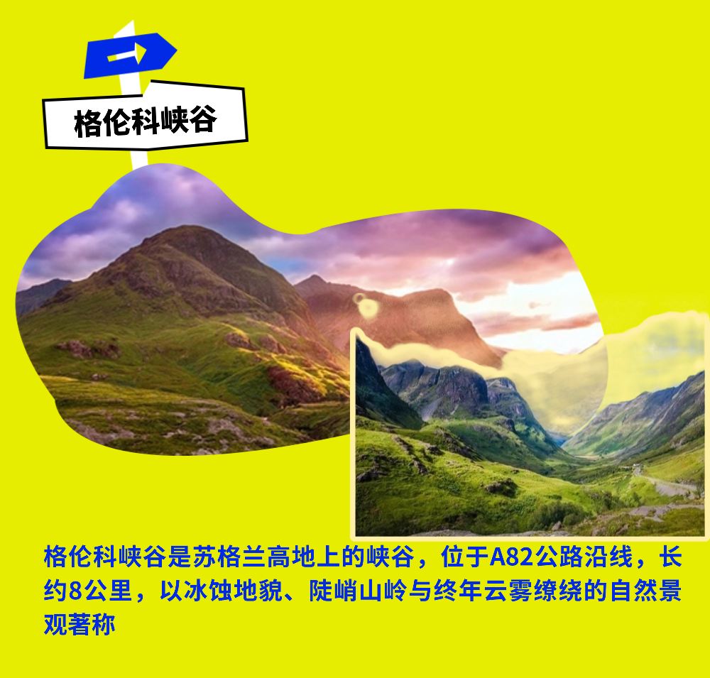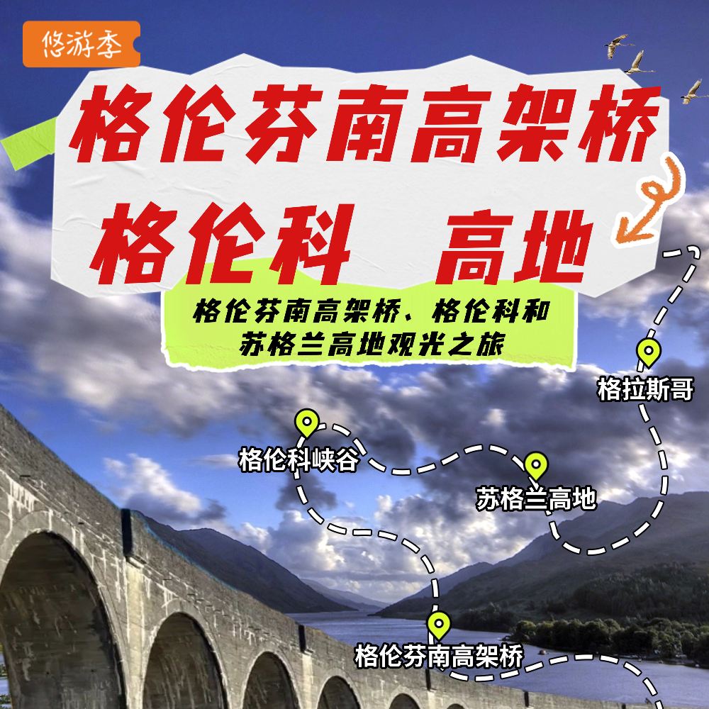 Depart from Glasgow in the early morning and head north, stopping for a break at the coastal town of Tyndrum in northern England along the way. Then continue to Glencoe to experience the magnificent scenery of the valley, take photos, and learn about its history. Proceed through the Highlands to Fort William for lunch, where you can enjoy views of the lake and gaze at Ben Nevis in the distance. After lunch, head east to the Glenfinnan Viaduct, famous for its appearances in the Harry Potter films. In summer, you might even witness the classic moment when the Jacobite Steam Train crosses the viaduct (Note: The steam train is operated by another company, so its operation cannot be guaranteed). The Glenfinnan Monument stands amidst the mountains by Loch Shiel, symbolizing a significant historical event in Scotland. Spend about an hour here to learn about the Jacobite history and capture the surrounding Scottish landscapes. Begin the return journey to Glasgow from Glenfinnan, crossing the "Neptune's Staircase," a series of canal locks that represent an engineering marvel in Scotland. Continue south, passing by Loch Lomond, and take a break in the town of Tarbet before heading back to Glasgow.