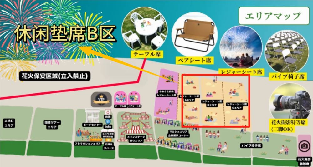 ▲ The leisure mat area [Zone B] is marked by the red box in the diagram, where you can enjoy free time. Please bring your own picnic mat (limited to 1×1 meter/1 square meter per person). ※Estimated arrival time in Japan is around 23:00. The return time is for reference only. Please note that delays may occur during peak travel periods such as consecutive holidays. In case of significant delays due to traffic congestion, passengers who choose to take a taxi or arrange accommodation independently will be responsible for the associated costs. We appreciate your understanding.