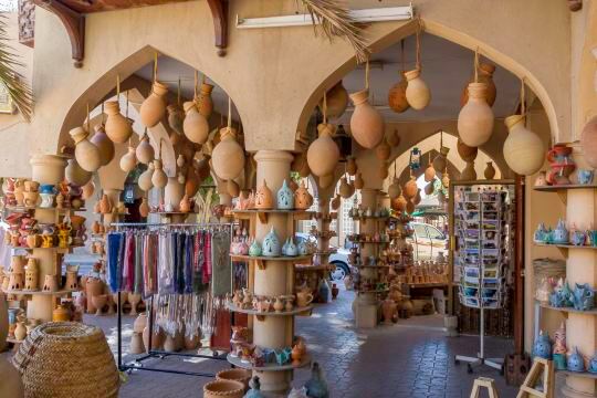 Nizwa's traditional market is famous for its handmade silver jewelry, intricately crafted "Khanjar" (traditional curved daggers), and pottery, representing the cultural symbols of Nizwa.